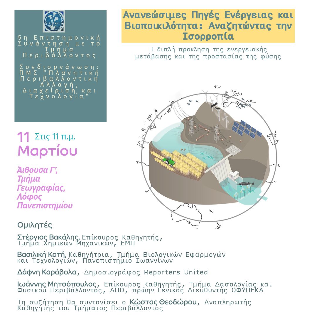 To Τμήμα Περιβάλλοντος και το Πρόγραμμα Μεταπτυχιακών Σπουδών «Πλανητική Περιβαλλοντική Αλλαγή, Διαχείριση & Τεχνολογία» οργανώνουν HYBRID EVENT με θέμα "Ανανεώσιμες Πηγές Ενέργειας και Βιοποικιλότητα: Αναζητώντας την Ισορροπία. Η διπλή πρόκληση της πράσινης μετάβασης και της προστασίας της φύσης". Στην επιστημονική αυτή συνάντηση  εξετάζουμε τη σχέση μεταξύ ενεργειακής πολιτικής και προστασίας της φύσης, συζητώντας ζητήματα όπως: […]